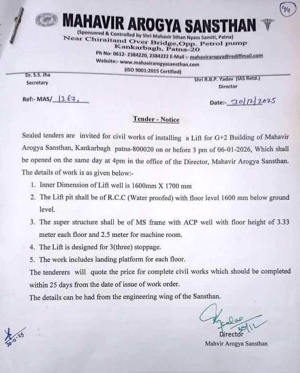Sealed tenders are invited for civil works of installing a Lift for G+2 Building of Mahavir Arogya Sansthan, Kankarbagh patna-800020 on or before 3 pm of 06-01-2026, Which shall be opened on the same day at 4pm in the office of the Director, Mahavir Arogya Sansthan. The details of work is as given below:-
